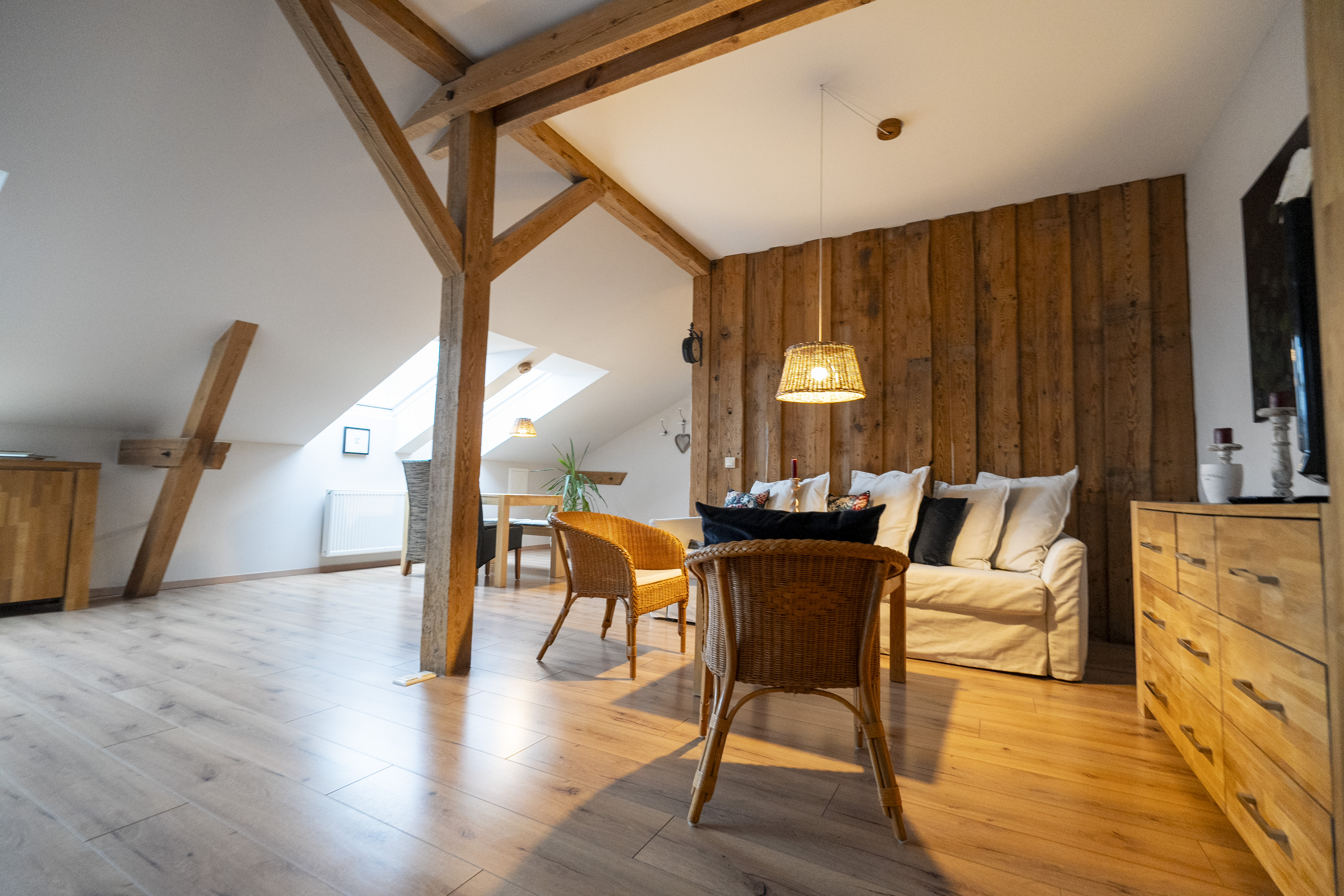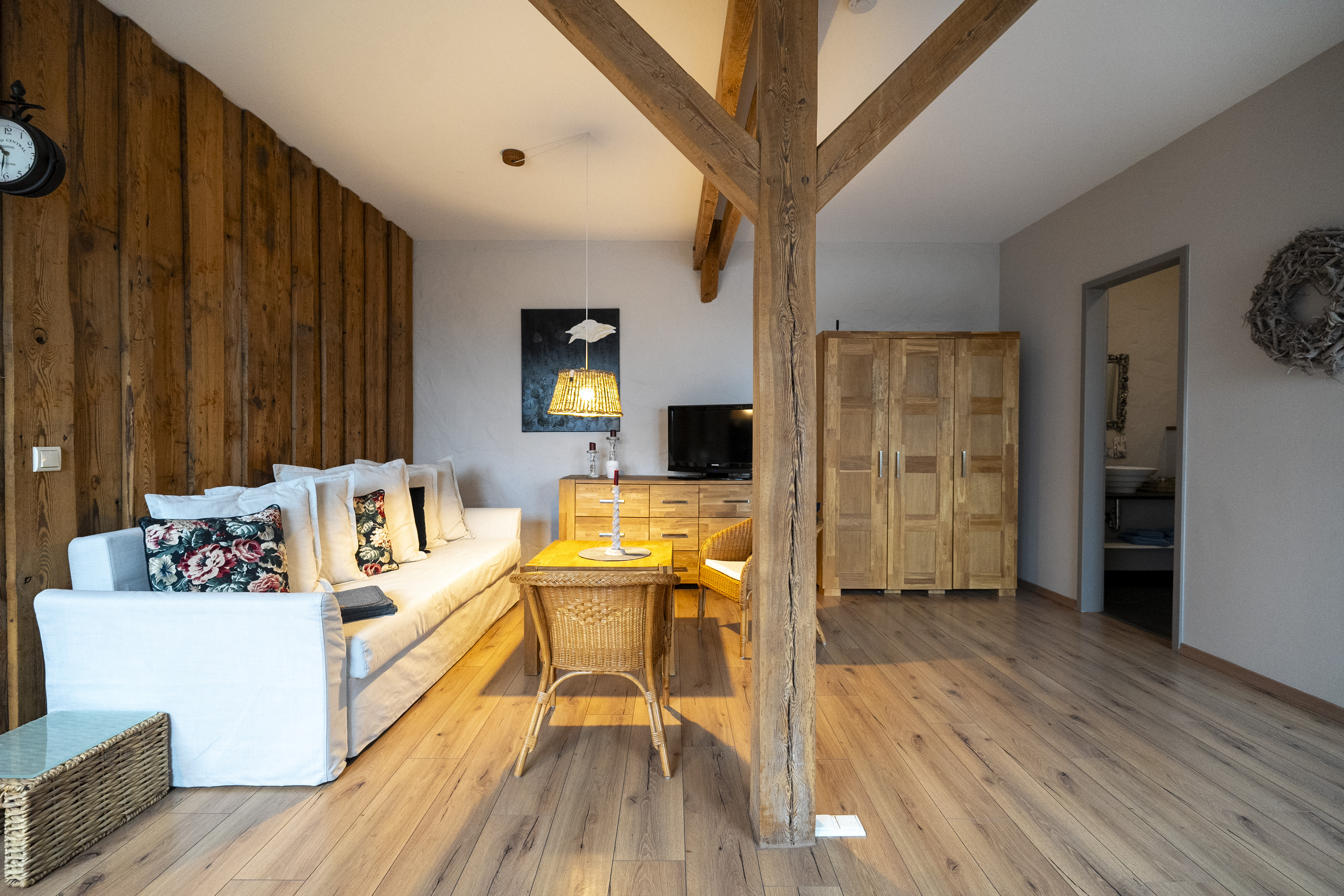 62 qm großes Apartment für bis 2 Personen mit Wohnbereich, Schlafbereich, Essbereich und abgetrennter Einbauküche.