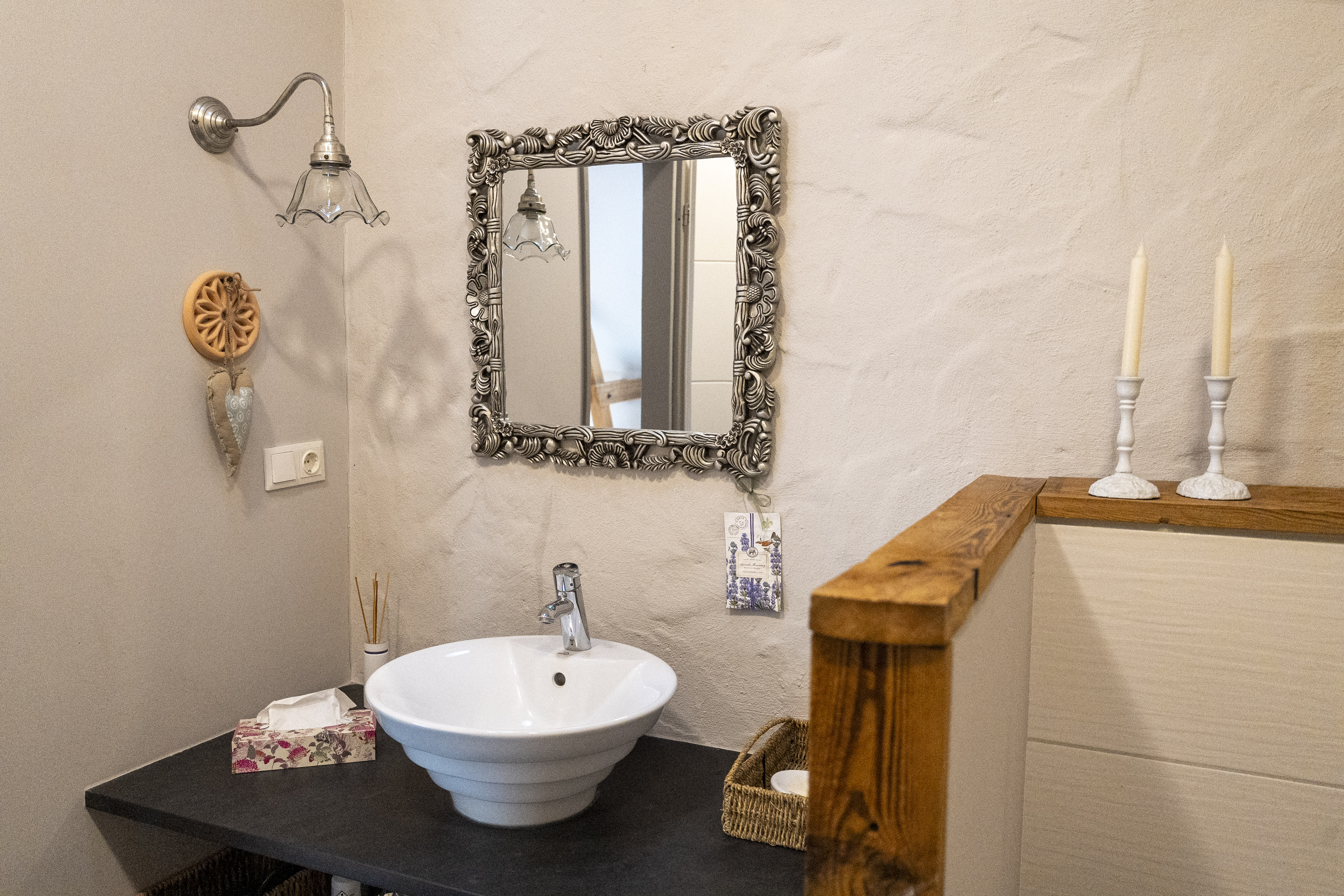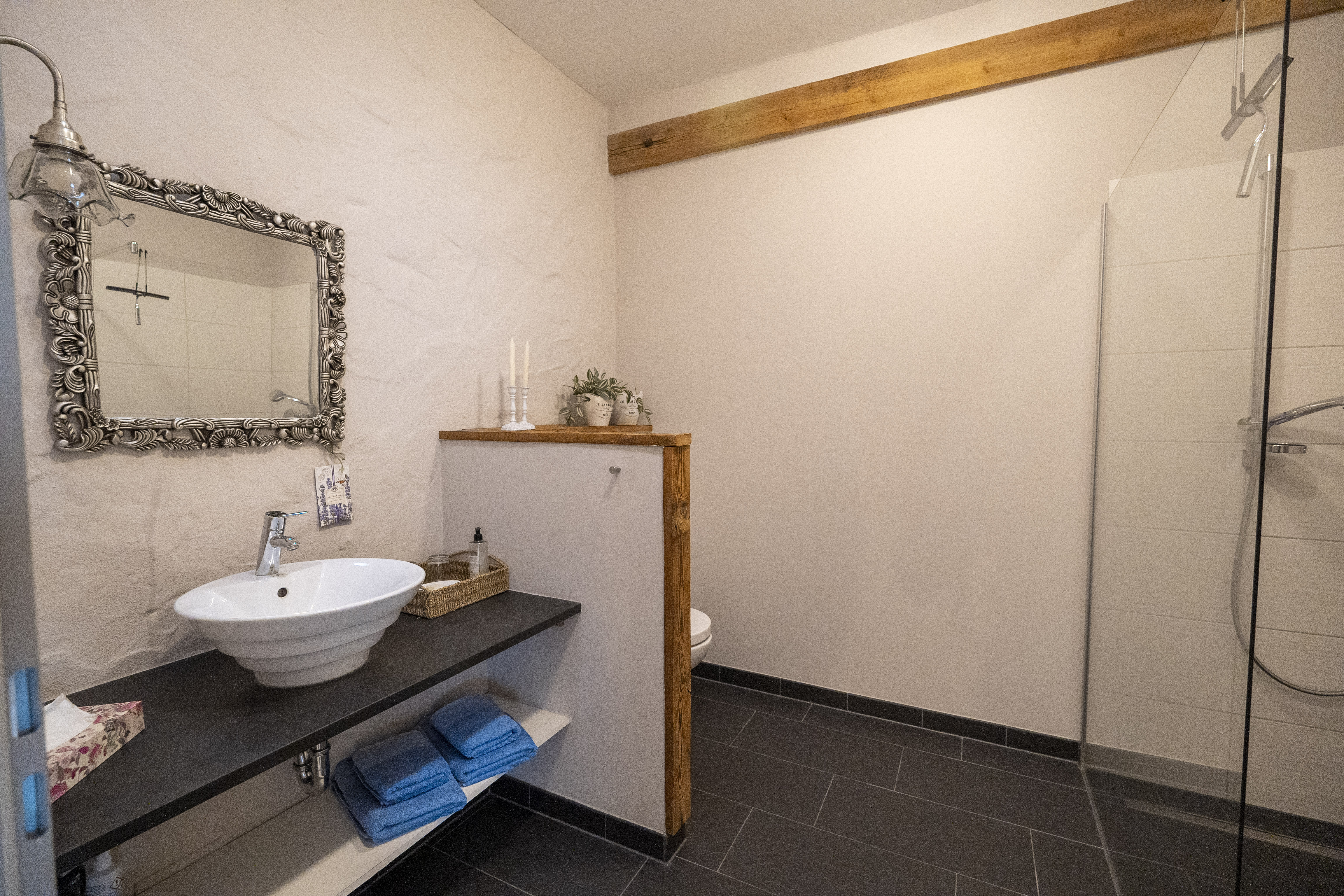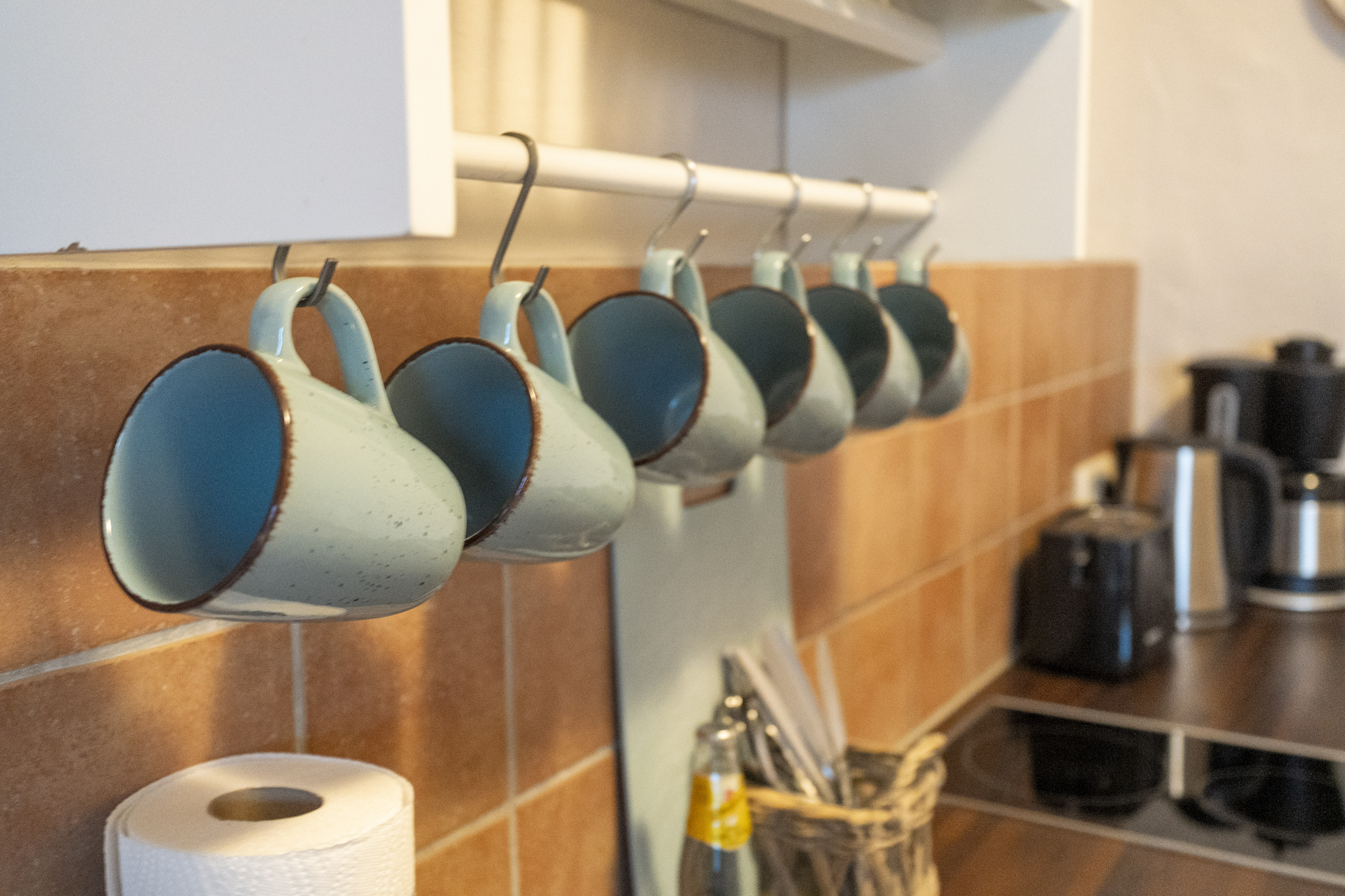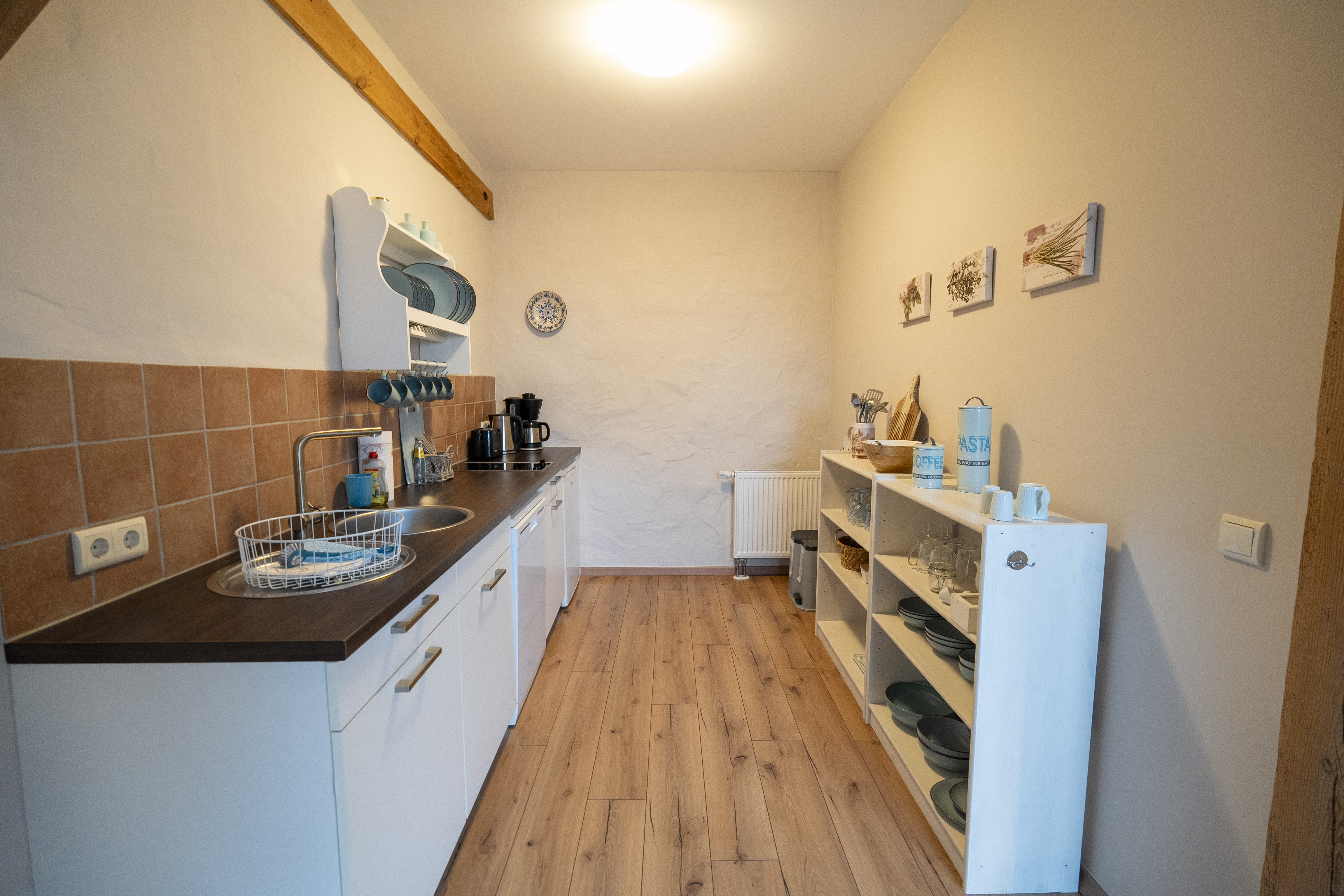 Naturholzmöbel, Sitzecke mit Ottoman, TV, Bett (160 x 200 cm), Kühlschrank, Geschirrspüler, Ceranfeld mit 2 Kochfeldern, Kaffeemaschine, Wasserkocher - auf Anfrage Toaster. Bad (7,5 qm) mit Dusche (140 x 100 cm), Waschtisch, Fön.